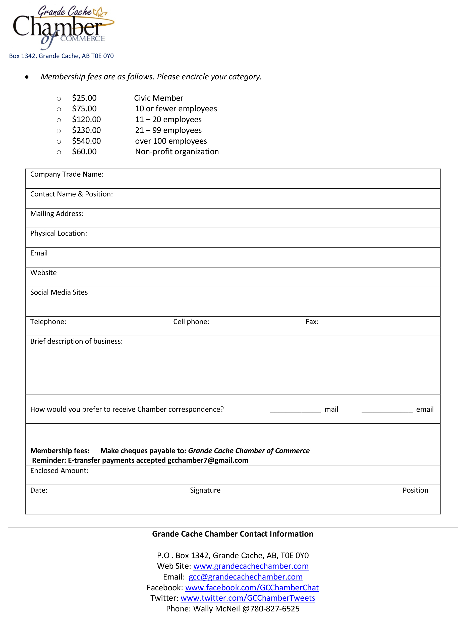 The Grande Cache Chamber of Commerce focuses on providing services such as networking, promotion, advocacy, value added benefits and community involvement. The Chamber plays a role of advocacy on behalf of the businesses of Grande Cache and surrounding areas. The Board of Directors identifies issues or barriers to growth for their members. The Chamber develops strategies through which to address and resolve issues or barriers.